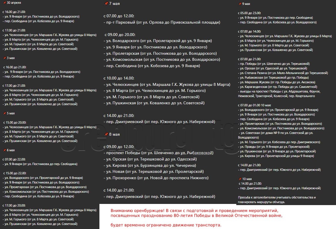 Вниманию оренбуржцев! В связи с подготовкой и проведением мероприятий, посвященных празднованию 80-летия Победы в Великой Отечественной войне, будет временно ограничено движение транспорта.