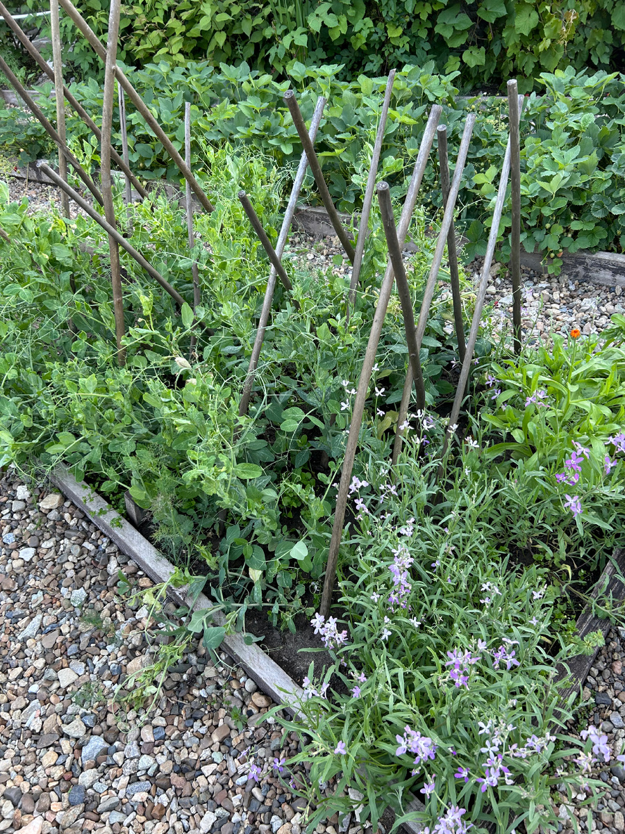 Думаю, что почти все выращивают на огороде горох. Его очень любят и дети, и взрослые. Подойти к грядке и сорвать несколько стручков с молодым горохом - так просто и так вкусно. Но горох - это не только полезно и вкусно, но еще и красиво! И очень просто вырастить. Из года в год мы собираем, храним и потом сеем свои семена. Кстати, хороший способ посеять горох в ровную линеечку, это наметить ряд вилами. Обязательно попробую такой способ в этом году. Горох быстро растет и оплетает предложенные ему опоры. Я использовала разные виды опор, но остановилась на варианте, который покажу сейчас - мне кажется, он наиболее соответствует духу моего огорода. Мой огород обладает свободным и непокорным нравом. В нем смешаны корнеплоды и зелень, овощи и цветы. А по краю растет еще и картошка. В любом огороде хорошо смотрятся вертикали, например декоративные луки, которые очаровательны и во время цветения, и позже, когда шары теряют цвет. Речная галька, брусчатка, ограждения грядок из потемневшего со