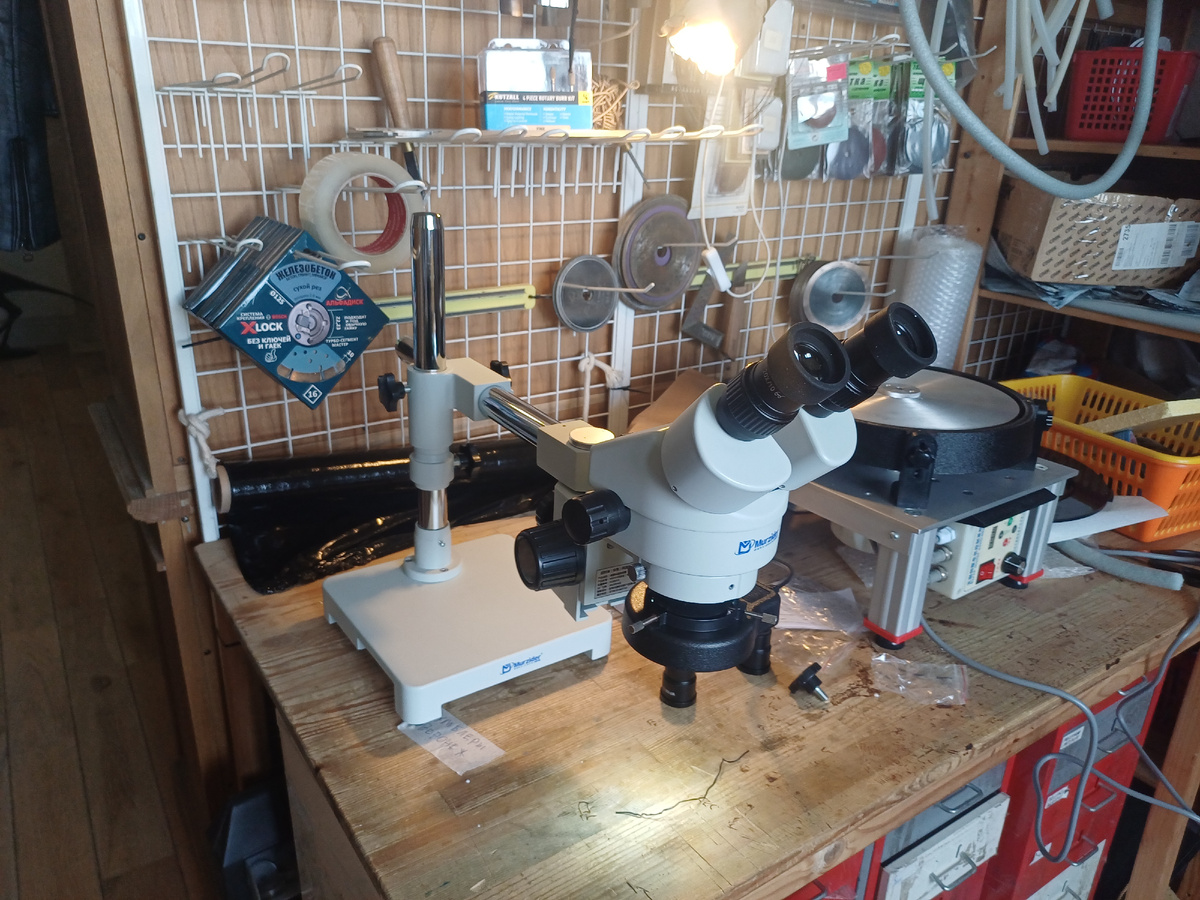 Дождался с Таобао ювелирный микроскоп. Кстати, бюджетно, 25000 руб. В чем его смысл? Это стереомикроскоп, фокусное расстояние нестандартное - 160 мм, вместо 110 мм. Это значит, я могу бормашинкой орудовать под окулярами спокойно, не задевая оптику. Только нужно на линзу надеть стеклянный колпачок, чтобы не забрызгивать окуляр каменной пылью. Зачем нужен микроскоп? Прорабатывать детали на камне в ювелирных размерах. Смотреть царапины, зашлифовывать. Нужен микроскоп, без него качества не будет. Взял бинокуляр, но бывают еще тринокуляры, с выводом изображения на экран. В этом случае призма распределяет свет еще на комп.выход, светосила теряется. Мне это не нужно, у меня 2 глаза, смотреть буду только я, поэтому бинокуляр.