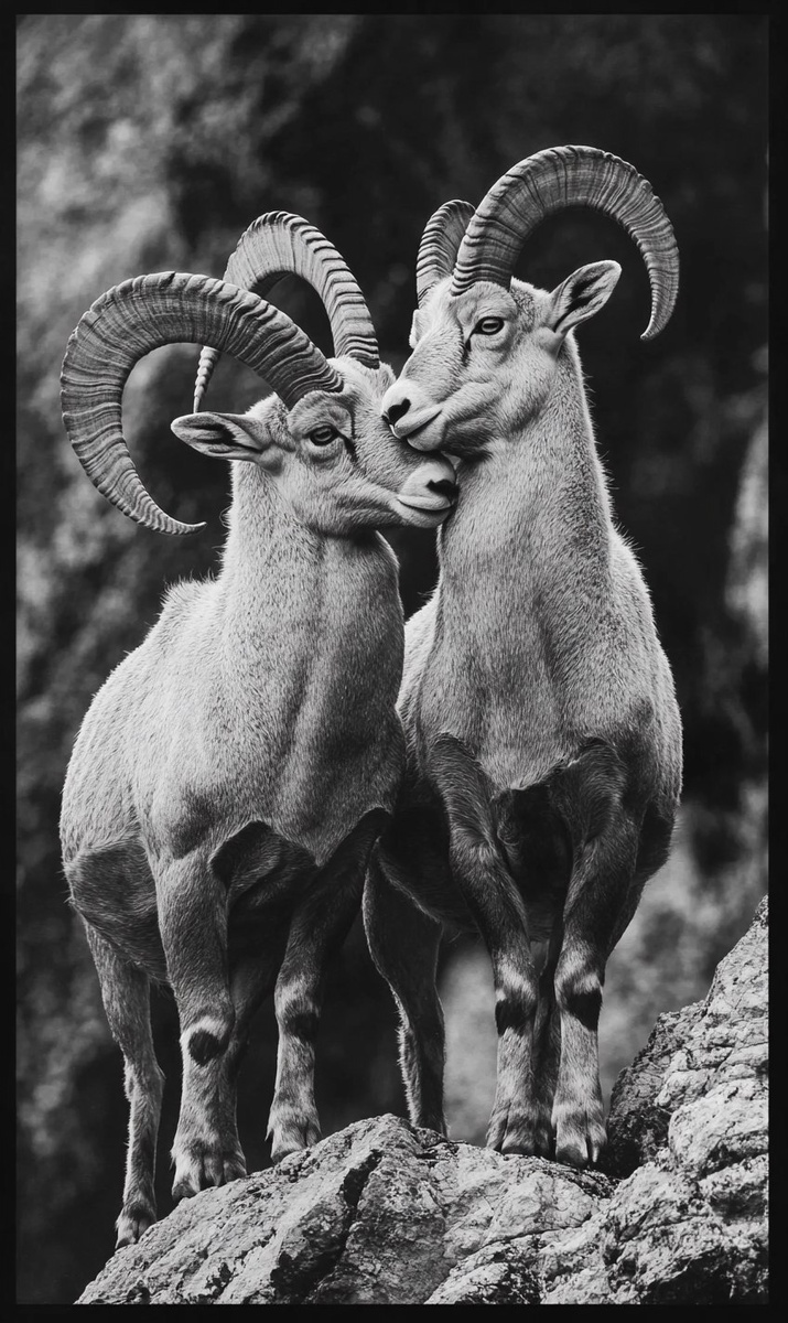 Создано на основе запроса: Black and white photograph of an alpine ibex with large horns standing on its hind legs, holding the head of another alpine ibex and forcing it to be silent by sitting upon its neck. The background is blurred. A black border outlines the image.