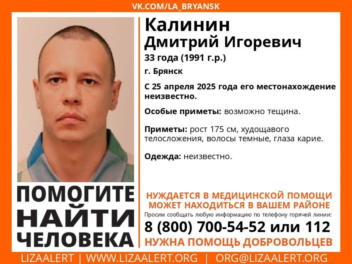 Сегодня, 29 апреля, волонтеры поисково-спасательного отряда «Лиза Алерт» сообщили о внезапном исчезновении 33-летнего Дмитрия Калинина из Брянска. Ориентировка появилась на официальной странице поисковиков. Известно, что на связь с родными молодой человек не выходит с 25 апреля. На данный момент его местонахождение неизвестно. Осложняется все тем, что горожанин нуждается в медицинской помощи. Дмитрий имеет худощавое телосложение, рост - 175 см, волосы темно-русые, глаза карие. «Всем, кто располагает сведениями о пропавшем, просьба позвонить по телефонам 88007005452 (Горячая линия ЛА) или 02, 102 (полиция),» - обратились к брянцам волонтеры.