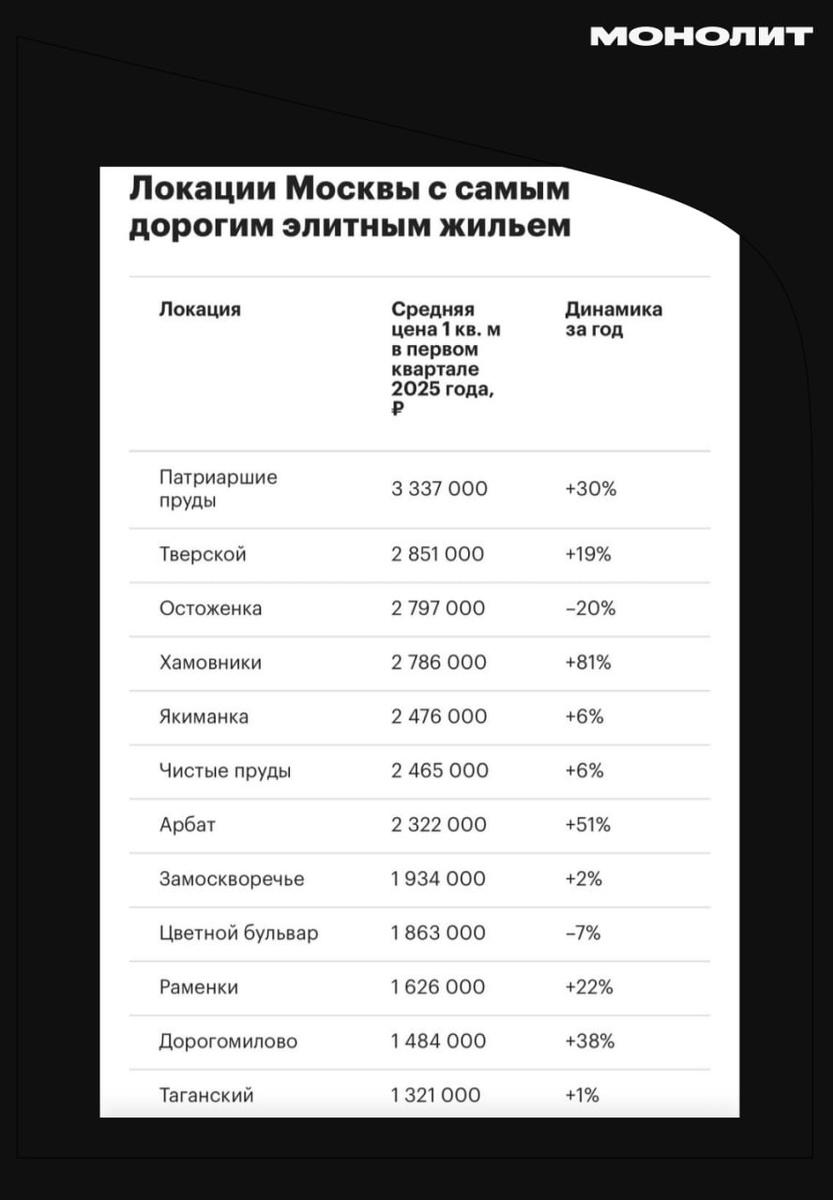 В каких районах Москвы расположено самое дорогое элитное жилье В I квартале текущего года на первом месте по средней стоимости 1 кв. м в элитных новостройках Москвы стали Патриаршие пруды с 3,33 млн руб./кв м. Эксперты связывают успех региона с высоким спросом у покупателей. На 2 месте Тверской район – 2,85 млн руб., в Остоженке 2,79 млн руб., в Хамовниках 2,78 млн руб. и Якиманке 2,47 млн руб. #монолит #ценынажилье 🧊 Монолит