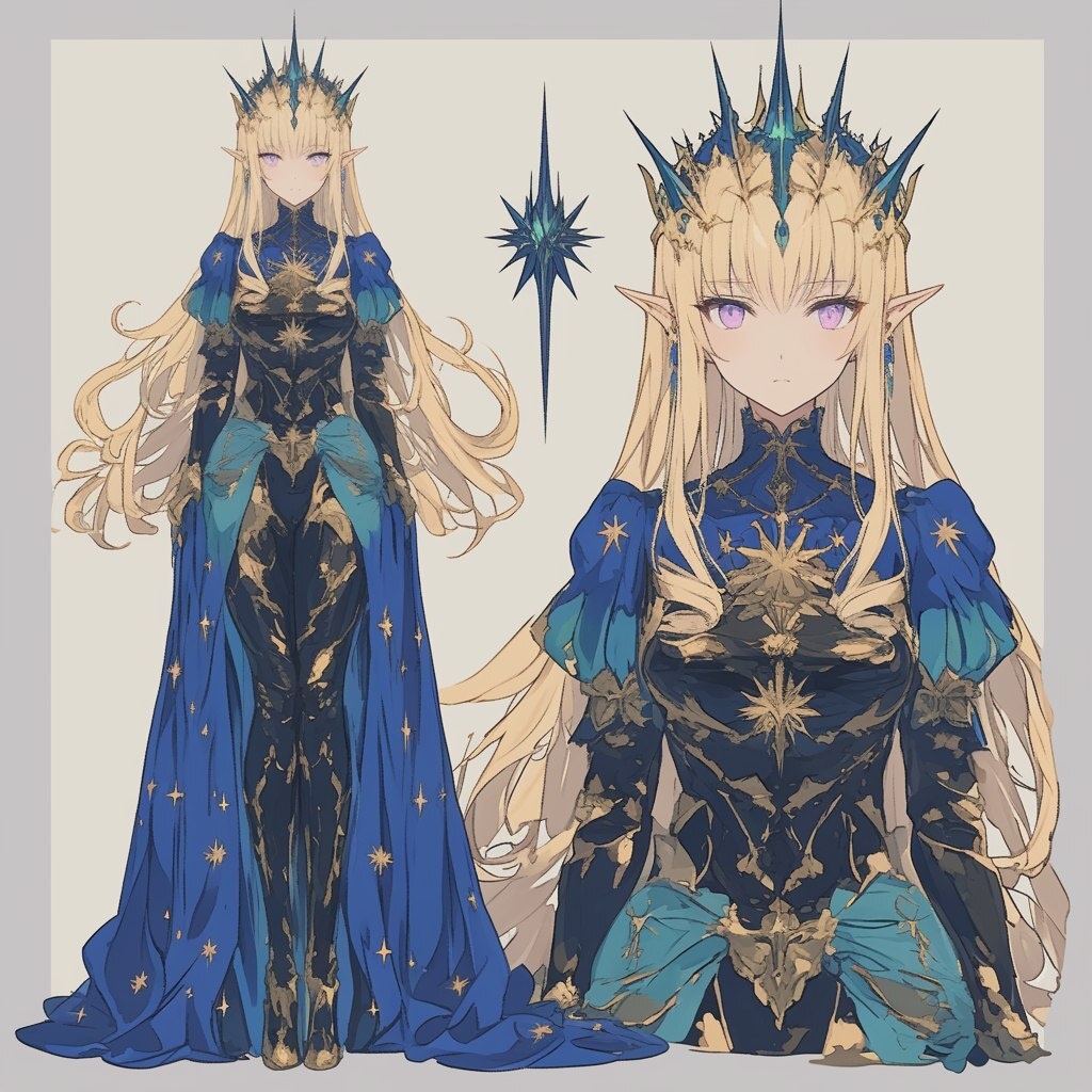 Создано на основе запроса: Full-length queen girl with light brown hair and purple eyes in a luxurious cold blue dress