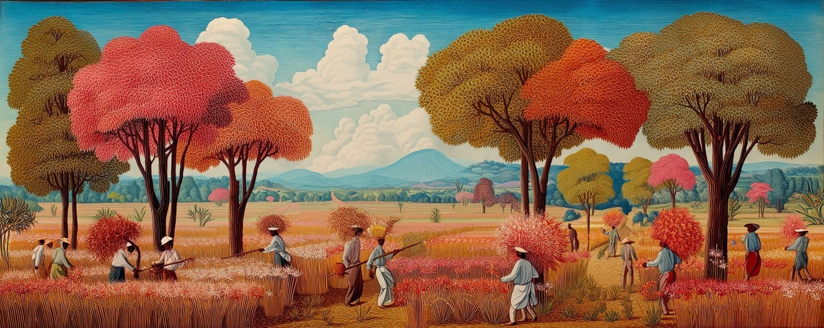 Создано на основе запроса: peasants in lycoris harvest, colorful flower field in country engraving landscape, rural brazilian colonial