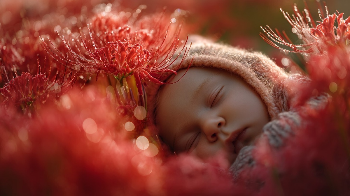 Создано на основе запроса: a baby sleepping on a field of lycoris, anne geddes style in a lycoris field with little drops of dew on it