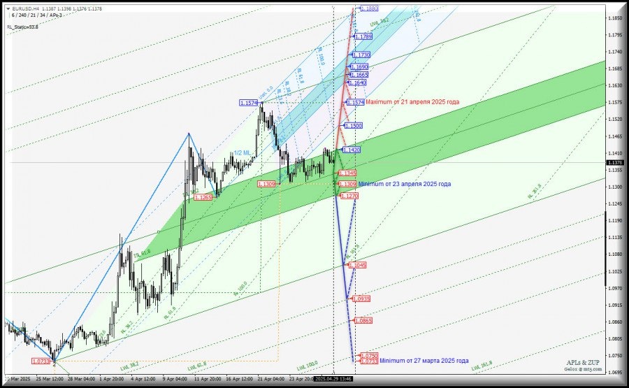 https://basechop.ru/wordpress/?p=40525 Операционный масштаб Minute (таймфрейм h4) EUR/USD- h4 – обзор вариантов движения с 30 апреля 2025 г. Предыдущий обзор EUR/USD (таймфрейм Daily) от 26.04.2025 г. 12:15 ____________________ Euro vs US Dollar Развитие движения единой европейской валюты – EUR/USD-h4 – с 30 апреля 2025 года продолжится в соответствии с отработкой и направлением пробоя границ зоны равновесия (1.1270 – 1.1345 – 1.1420) вил старшего операционного масштаба Minute-h4 и с учетом отработки minimum 1.1309 от 23 апреля 2025 года. Восходящее движение. При возврате единой европейской валюты выше верхней границы ISL38.2 зоны равновесия вил старшего операционного масштаба Minute-h4 – пробой уровня сопротивления 1.1420 – восходящее движение данной валютной пары может быть продолжено к начальной линии SSL Minuette-h1 (1.1500), maximum 1.1574 от 21 апреля 2025 года и к границам зоны равновесия (1.1640 – 1.1.1690 – 1.1730) вил младшего операционного масштаба Minuette-h1. Нисхо