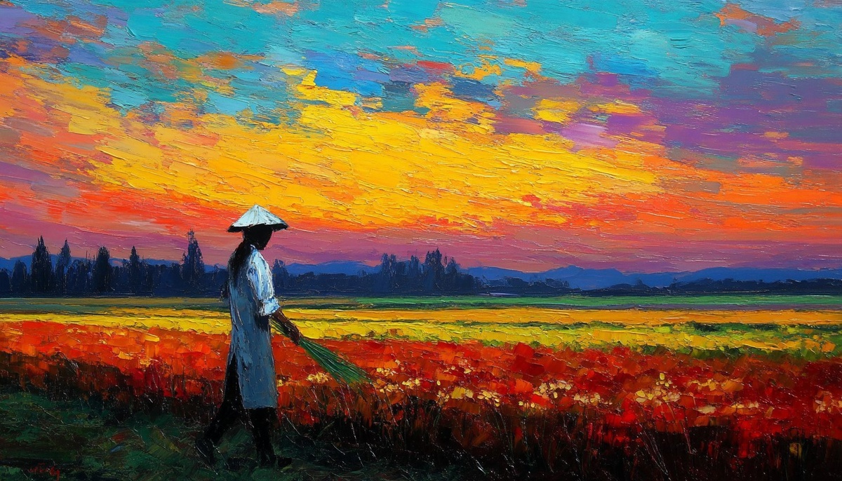 Создано на основе запроса: A peasant in a lycoris field harvest, at sunset, in abstract art by leonid afremov and Candido Portinari, oil