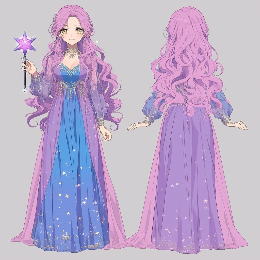 Создано на основе запроса: Full-length queen girl with purple hair and brown eyes in a luxurious pink dress