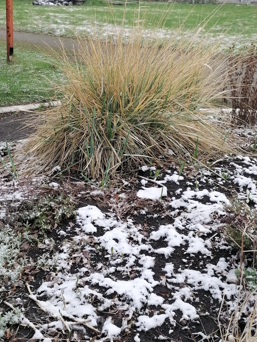 Сегодня провожала внучку в школу. У нас на Урале выпал снежок. Перед школой в прошлом сезоне появилась красивая клумба. Так она выглядела сегодня Бвдан уже зацвел Надеюсь, что растения выдержат. Все таки температура минус 1. А что у нас делается на даче, увидим на днях. Гортензии были высажены в апреле в грунт и укрыты только спандбондом. Розы не стала укрывать. Все остальное тоже без укрытия. Ох уж, эта погода на Урале...