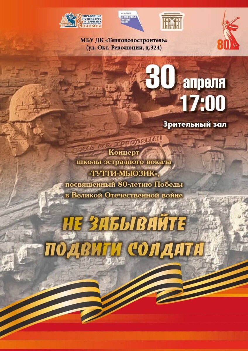 ДК «Тепловозостроитель» приглашает на концерт к 80-летию Великой Победы. В программе трогательные и вдохновляющие песни, которые расскажут о героизме и мужестве солдат, о любви к Родине и о том, как важно помнить историю. Вас ждут выступления солистов школы эстрадного вокала «Тутти-Мьюзик», вокального ансамбля «Отражение», а также детского эстрадного хора «Тутти-Мьюзик». Вход свободный! 6+