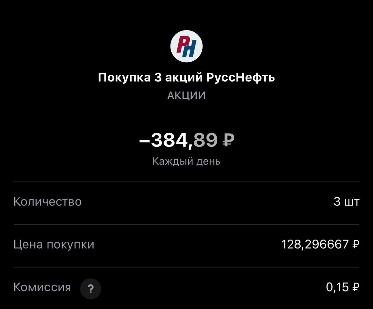 Всем привет! Покупка на сегодня #175, с учетом оставшихся денег с прошлых сделок. Статистика портфеля на стороннем сервисе, можно посмотреть по "ссылке" Напомню это челендж с коллегами, каждый рабочий день пополняем брокерский счет на 250 рублей и инвестируем. Если возникли вопросы или есть не понимание, что делать. Задавайте «тут» Покупка #175 🟢 «РуссНефть» 128.29 rub #RNFT 3 лота #каждыйсможет #челенджсколлегами ✈️ Стас Мироненко 📹Youtube | 📹Rutube