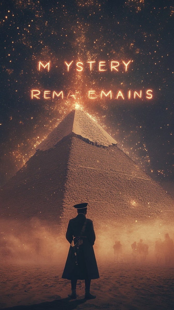 Создано на основе запроса: Napoleon silencing reporters, scene melts into rising aerial over pyramid, stars form words "MYSTERY REMAINS