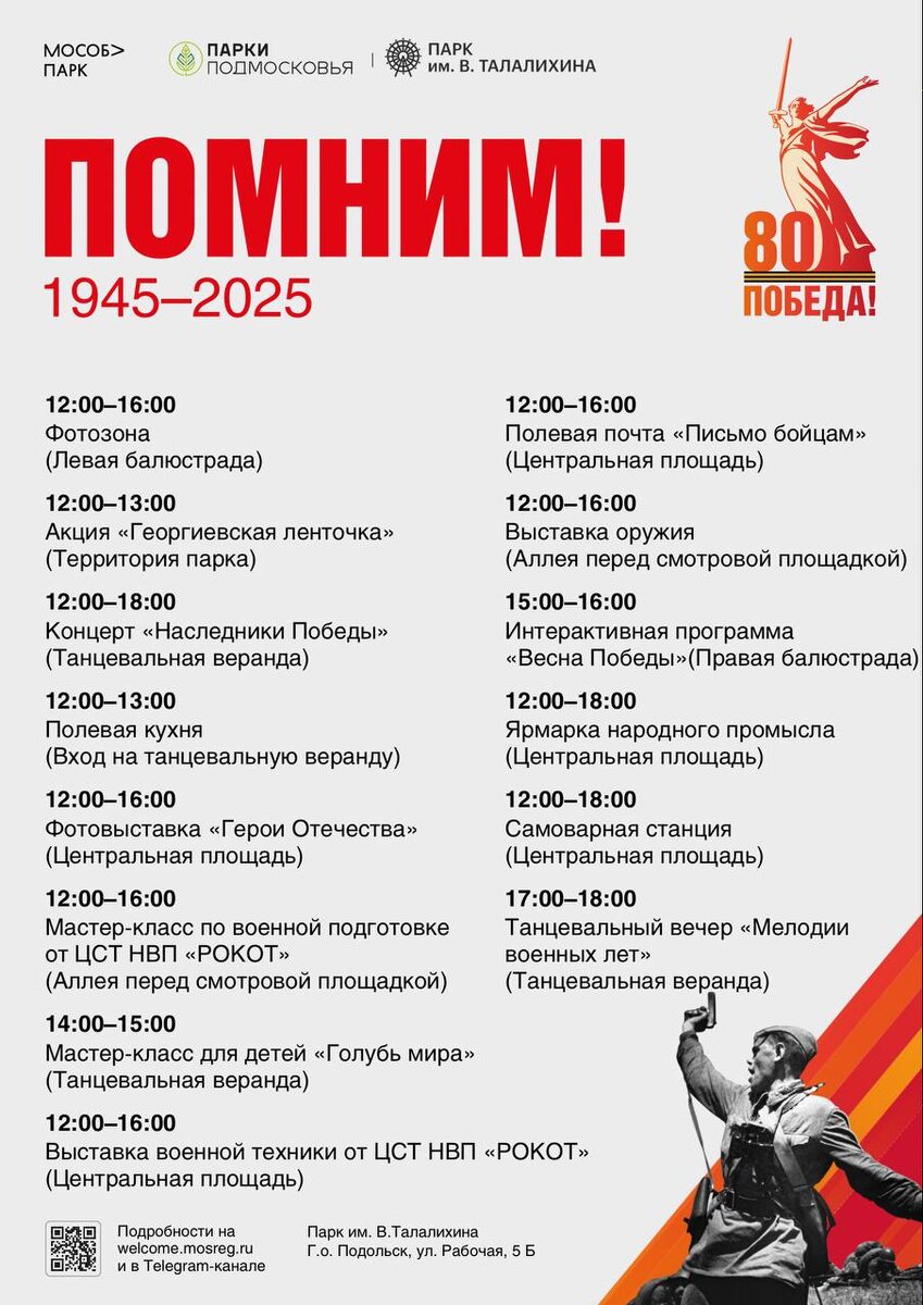 ✨ 9 мая в Парке им. В. Талалихина ⭕12.00-16.00 Фотозона ⭕12.00-18.00 Праздничный концерт «Наследники Победы» ⭕12.00-13.00 Полевая кухня ⭕12:00-16:00 Фотовыставка «Герои Отечества» ⭕12.00-16.00 Мастер-класс по военной подготовке ⭕14.00-15.00 Мастер-класс для детей «Голубь мира» ⭕12.00-16.00 Выставка военной техники ⭕12.00-16.00 Полевая почта «Письмо бойцам» ⭕12.00-16.00 Выставка оружия ⭕15.00-16.00 Интерактивная программа «Весна Победы» ⭕12.00-18.00 Ярмарка, самоварная станция ⭕17:00-18.00 Танцевальный вечер «Мелодии военных лет» 🚫 Возраст: 0+ 📆 09.05.2025 🕒 12:00 🏢 Парк культуры и отдыха им. В. Талалихина 📍 г. Подольск, ул. Рабочая, 5Б 💰 Вход свободный❗️ #webПодольск ✅ Мероприятия Подольск https://dzen.ru/id/66ed500f7b5671493eca3fd6 http://vk.com/podolsk_events http://dzen.ru/podolsk_events