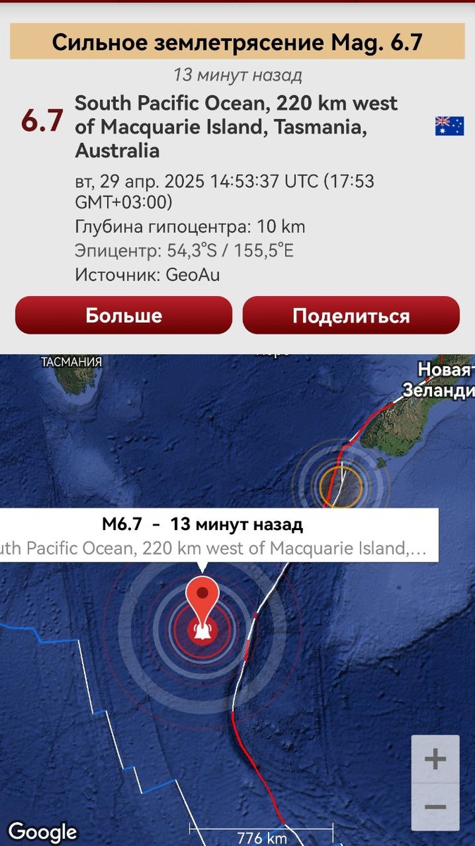 Следом и еще одно М6+ к югу от Новой Зеландии произошло