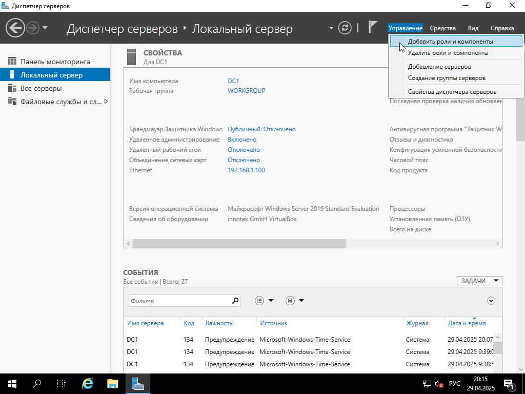 Для начала устанавливаем Windows Server 2019 и производим первичную настройку ОС. Затем открываем "Диспетчер серверов" и нажимаем "Управление" - "Добавить роли и компоненты" Нажимаем "Далее" Нажимаем "Далее" Нажимаем "Далее" Ставим галочку напротив "Доменные службы Active Directory" Нажимаем "Добавить компоненты" Нажимаем "Далее" Нажимаем "Далее" Нажимаем "Далее" Нажимаем "Установить" После установки необходимо запустить настройку роли. Нажимаем "Повысить роль этого сервера до уровня контроллера домена" Если это первый контроллер домена, то выбираем "Добавить новый лес" в поле "Имя корневого домена" вписываем имя домена и нажимаем "Далее" Вводим "Пароль" и "Подтверждение пароля" для восстановления контроллера домена и нажимаем "Далее" Нажимаем "Далее" Нажимаем "Далее" Нажимаем "Далее" Нажимаем "Далее" Нажимаем "Установить" Нажимаем "Закрыть" и сервер будет перезагружен