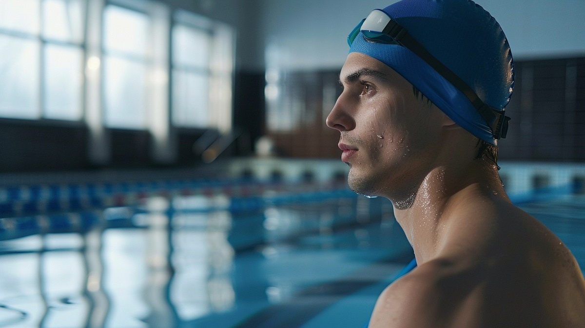 Создано на основе запроса: A male professional swimmer wearing a swim cap and goggles, standing confidently at the edge of a clean indoor