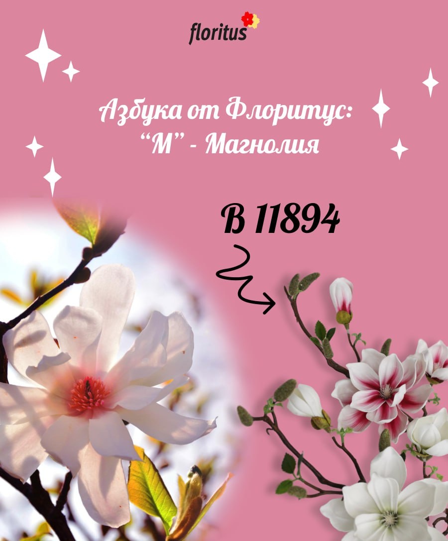 🌸 Азбука цветов: М — Магнолия 🌸 Магнолия — это воплощение утончённой красоты и женственности. Её крупные, роскошные цветы распускаются весной, наполняя сад тонким, нежным ароматом. Магнолии бывают белыми, розовыми, кремовыми и даже фиолетовыми — каждый оттенок по-своему чарует и завораживает. 🌍 Эти растения происходят из Азии и Америки, а их история насчитывает миллионы лет — магнолии считаются одними из древнейших цветущих растений на Земле. В культуре Востока магнолия символизирует чистоту и благородство, а в Европе — любовь к природе и изящество. 💡 Интересный факт: магнолии не привлекают пчёл — их опыляют жуки! У цветков плотные лепестки, способные выдержать тяжёлых насекомых. 🌿 В коллекции Флоритус вы можете найти великолепные искусственные магнолии, которые выглядят как живые. Они идеально подойдут для создания интерьерных композиций, свадебного декора или оформления фотозон. ✨