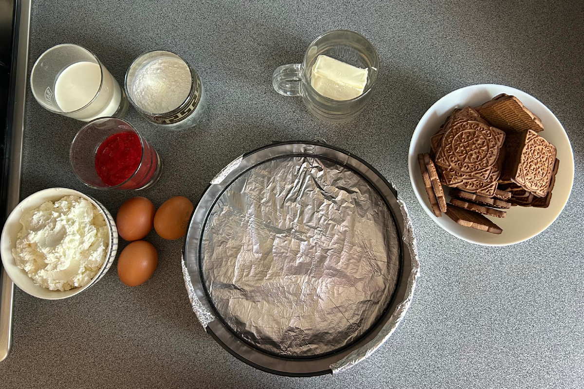 Для приготовления чизкейка подготовим необходимые ингредиенты. Основа: Начинка: Конфи: Для основы измельчаю печенье, в мелкую крошку, с помощью блендера. И добавляю в него уже растопленное сливочное масло. * Если под рукой не оказалось блендера - не страшно. Уберите печенье в плотный пакет и измельчите скалкой. Перемешиваю полученную смесь (консистенция должна быть похожа на влажный песок). Форма для выпечки у меня диаметром 24 см, дно застелила фольгой. *Дно формы лучше совсем не убирать, иначе основа посыпется, когда будете перекладывать готовый чизкейк. Высыпаю крошку и разравниваю стаканом. Основу выпекаю в предварительно разогретой до 200°С духовке 10 минут. Пока основа остывает займёмся начинкой. Все ингредиенты должны быть комнатной температуры! *Взбивать ничего не нужно, потребуется только силиконовая лопатка. В большой форме объединяю творожный сыр и сахарную пудру. Туда же вмешиваю по одному яйцу. *Ориентируйтесь по консистенции, она не должна быть слишком жидкой. В п