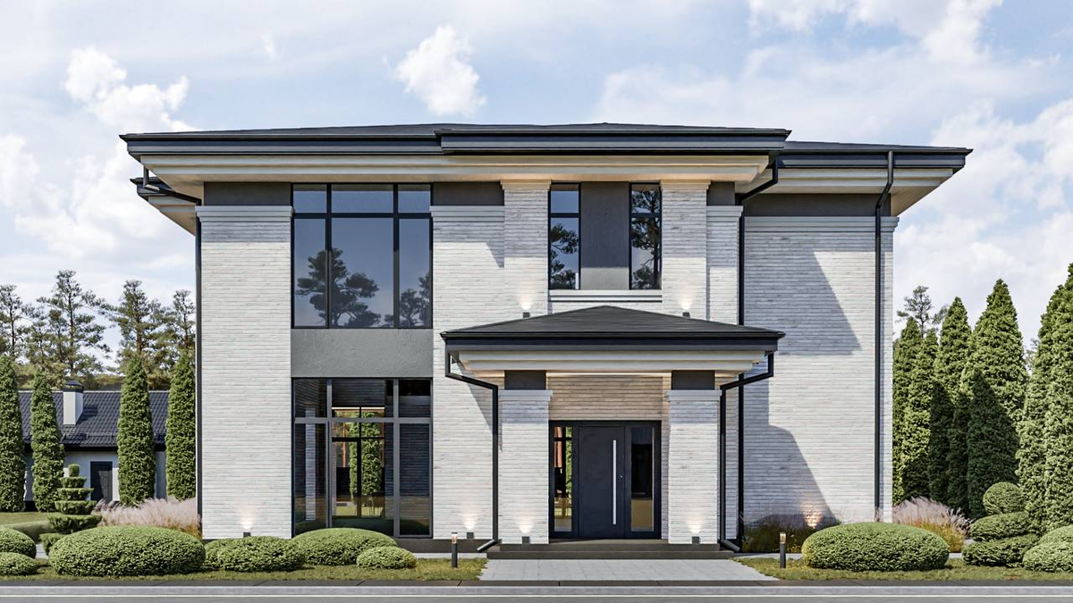 Сочетание утончённой аристократичности и тёплого домашнего уюта — самое точное описание этого проекта. Площадь дома — 283 квадратных метра + терраса 64,5 квадратных метра. Первый этаж — пространство, идеально подходящее для приёма гостей и отдыха с семьёй. Здесь есть прихожая с примыкающими к ней гардеробной и санузлом и кухня-гостиная площадью 74 квадратных метра — даже большая компания сможет разместиться с комфортом. Выход на террасу расположен возле кухонной зоны — удобно для завтраков на свежем воздухе. На первом этаже также находятся постирочная, кладовая и топочная с отдельным входом. Второй этаж — совсем иная концепция. Здесь всё организовано так, чтобы хозяева дома могли отдохнуть: две спальни, разделённые холлом с диванной группой и ТВ-зоной, гардеробная, ванная комната с двумя раковинами и дополнительная уборная. Отделка фасадов — белый ригельный кирпич в сочетании с тёмно-серой штукатуркой и декоративными белыми элементами. Скатная кровля будет покрыта мягкой битумной череп