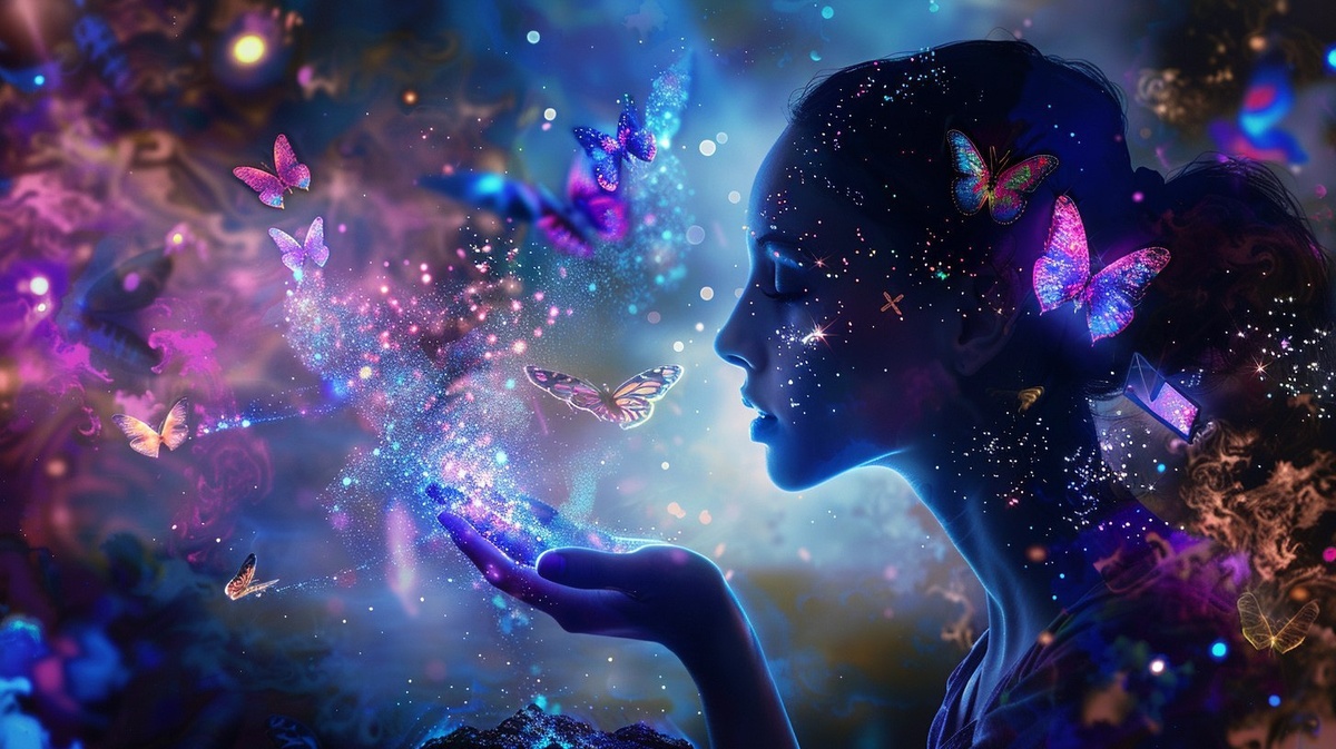 Создано на основе запроса: Spiritual silhouette of a woman touching glowing earth, her form disintegrating into sparkling energy. Abstract fractals and flowing glitter codes swirl from her fingertips into an aurora of Akashic symbols, luminous butterflies, and neon fungi. Colors explode in layers of #9800FF, #01E8CF, and #DEFE08. Scene radiates with cosmic dreamlike abstraction and starlit fog. Created Using: 5K resolution with HDR sparkle mapping, ethereal lightcode projection, fantasy surrealism toolkit, iridescent lens bloom, glitch art overlays, deep texture stacking --- Автоперевод: Духовный силуэт женщины, касающейся светящейся земли, ее форма распадается в сверкающую энергию. Необычно выглядит? 🤔 https://dzen.ru/id/65c0c65c86e4f837c27b24d7 #ИИ #AI #нейросеть #midjourney #art