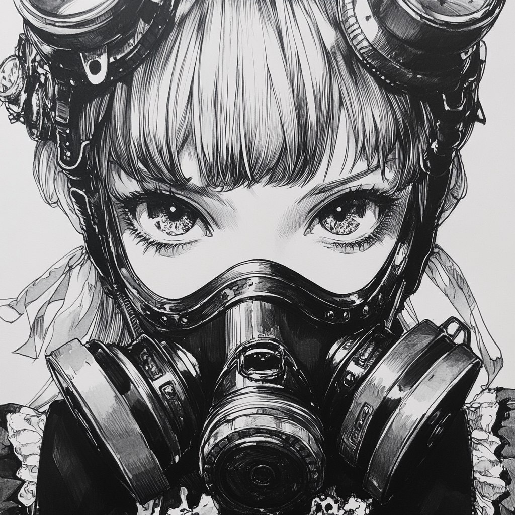 Создано на основе запроса: portrait of steam punk anime girl with gas mask illustration black pen work