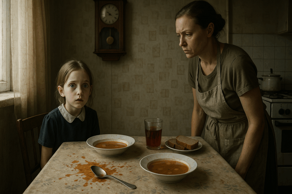 — Ты даже есть нормально не можешь, — сказала мать, вскочив со стула. — Теперь ещё и скатерть стирать. Всё как твой отец — только проблемы.