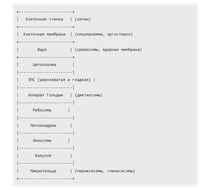 Особенности: В отличие от клеточной стенки растений, содержащей целлюлозу, клеточная стенка грибов содержит хитин. - Клеточная мембрана (Плазмалемма):Состав: Фосфолипиды, белки, а также эргостерол (аналог холестерина у животных).