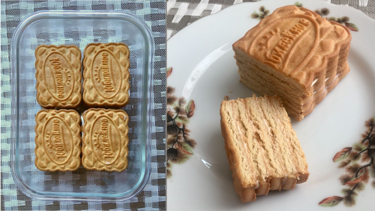 Простой десерт из двух продуктов – готовим сами! Попробуйте, и захотите делать регулярно на радость себе и близким! Понадобится купить всего 2 ингредиента: сметану и печенье. Сметана нужна не очень густая, лучше всего 10-15 процентов жирности. Печенье подойдёт «Юбилейное», «Топлёное молоко», «Земляничное» и похожее на них. Можно взять шоколадное – из тёмного теста (но без глазури, это важно). Дальше просто. Берём печенюшку, намазываем сметаной, сверху кладём другую печенюшку и чуть придавливаем, чтобы сметана распределилась равномерно между слоями печенья. Верхний слой мажем сметаной и кладём на него ещё печенье. Можно на этом остановиться, а можно сделать 4 или 5 слоёв печенья. Полученную конструкцию убираем в холодильник на несколько часов. Я обычно делаю это на ночь, но и 4-5 часов достаточно, чтобы печенье со сметаной превратилось в мягкий и нежный десерт. Его можно резать ножом – печенье при этом не хрустит и не ломается. На срезе десерт очень похож на торт из тонких коржей, соеди