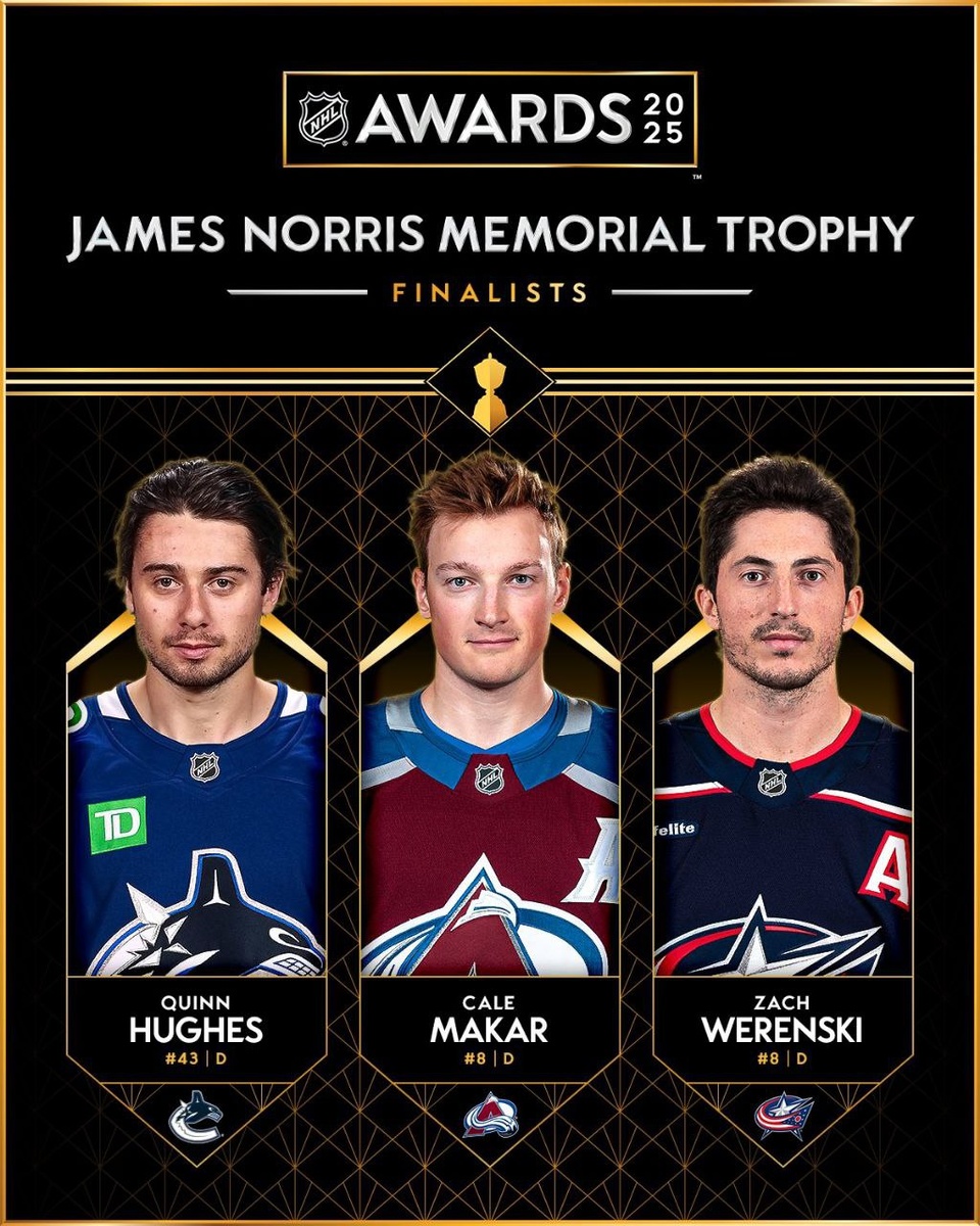 🏒Объявлены номинанты на Норрис Трофи Пожалуй, и тут без интриги. 🔫 Веренски слил концовку сезона. 🦈 Хьюз не играл из-за травмы 14 матчей. 🗻 Макар набрал за 80 игр 92 очка, из которых 30 — голы. ⬇️ Чат #нхл #nhl