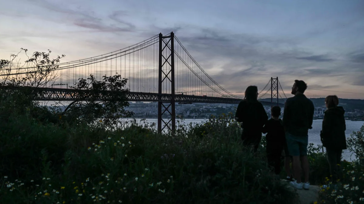Молодая пара стоит у смотровой площадки с видом на Лиссабон, 28 апреля 2025 года. Фото: Armando Franca / AP Photo / Scanpix / LETA
