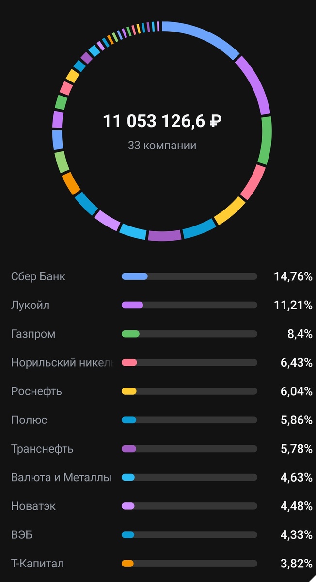 Всех приветствую, МИР! ТРУД! МАЙ! Ну а раз так значит апрель прошел и можно подводить итоги по основному портфелю. Март был завершен на отметке 11,37 млн рублей А вот апрель еле удержался выше 11 млн рублей Это конечно особо роли не играет так как денежный поток формирую штуки акций, а не сумма на главной странице приложения. А вот штуки понемногу увеличиваются, что не может не радоваться. Вот и все я практически перестал делать сделки по основному портфелю. Пополняю его по остаточному принципу, пока стараюсь ИИС под максимум вычет и портфель с ОФЗ чтобы увеличить поток от купонов пока ставки по дальним ОФЗ больше 14%.