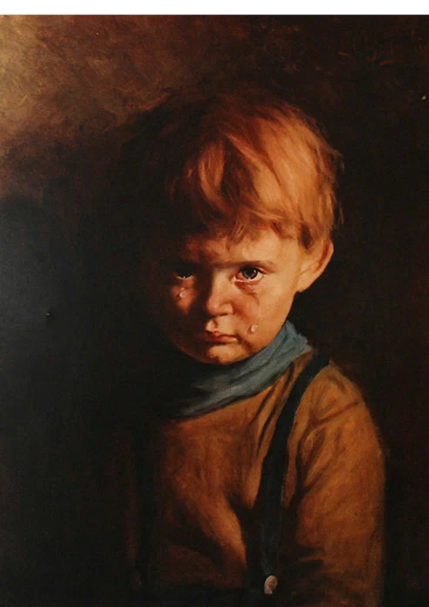 «Плачущий мальчик» — репродукция картины итальянского художника Джованни Браголина (также известного как Бруно) В 1950х, он создал эту картину. От одного вида такой работы становится не по себе. История "плачущего мальчика" ужасная. По легенде, в качестве модели, художник выбрал бездомного мальчика. Ведь он мог делать с ним все, что захочет. И оставаться безнаказанным. Браголин хотел чтобы картина получилась очень реалистичной. Но для этого надо было заставить ребенка плакать. Он знал, что мальчик боится огня, поэтому подносил к его лицу горящую спичку. Но когда мальчик не выдержал, он прокричал ему: "Чтобы ты сам сг**ел!" Браголин не придал значения его словам, закончил и прода картину. Но все таки проклятие сбылось. Браголин вместе со своей мастерской, сг**ел дотла. Но на этом история не закончилась. Когда «плачущий мальчик» попадал к новым владельцам, там случался пожар, который уничтожал все, кроме картины.