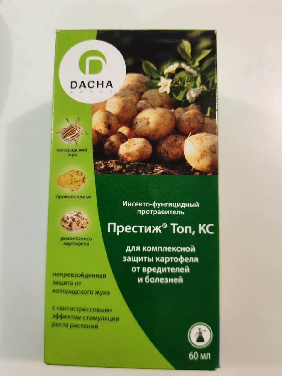 Престиж Топ это препарат с двумя Д В , предназначенный для протравливания клубней картофеля перед посадкой. Такая обработка в течении 50 дней спасает растения картофеля от основного вредителя колорадского жука и его личинок, а также от тлей, трипсов, белокрылок, цикадок, личинок щитовок. Столько же дней, он также будет защищать от вредителей, живущих в почве: личинок майского жука, медведок, проволочников и совок.