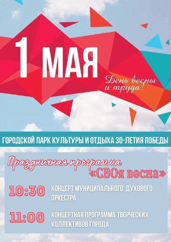 Приглашаем всех жителей и гостей города на праздничное мероприятие ко Дню Весны и Труда — «СВОя весна»! 🌳 Место: Городской парк культуры и отдыха (ул. Октябрьская, 131) 🕥 Время: • 10:30 — концерт муниципального духового оркестра под руководством Александра Свиридова • 11:00 — концертная программа творческих коллективов и солистов нашего города