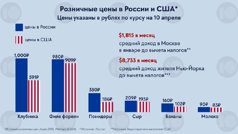 Москва дороже Нью-Йорка? По ценам на овощи, рыбу и молоко — да В исследовании Pointmedia сравнили стоимость продуктов в московском «Ашане» и нью-йоркском Walmart. Для пересчета цен использовали курс 86 рублей за доллар, а фунты перевели в килограммы. Вот несколько примеров из исследования: Молоко. Литр молока «Авида» (3,2% жирности) в Москве стоит почти 100 рублей (следовательно, упаковка 900 мл — 90 рублей), тогда как аналогичное молоко Great Value в США обходится дешевле — примерно 83 рубля за литр. Сыр «Чеддер». В Москве по акции сыр «Брест-Литовска» стоит 209 рублей за 200 г (без скидки — 284 рубля), в Walmart такой же сыр Great Value стоит 193 рубля за 226 г. Замороженное филе форели. В «Ашане» — 980 рублей за 450 г, в США — 909 рублей за тот же вес. Кажется, что разница всего несколько рублей и сейчас курс хороший, но средняя зарплата в Нью-Йорке в разы выше московской. По официальным данным, в Москве средний доход составляет около 180 тысяч рублей в месяц, а в Нью-Йорке