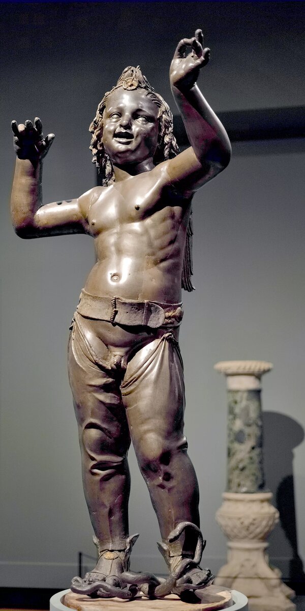Но в скульптуре есть и другие атрибуты – пояс Гипноса (Гипнос раздал лепестки мака, хотя маки также символ Кибелы), сандалии Меркурия, хвост Пана. Змея, извивающая у его ног, – хтонический символ жизни. Прическа и штаты напоминают об анатолийском происхождении культа Кибелы и Аттиса. Обнажение гениталий – символ ритуального осквернения, которому подвергались жрецы богини Кибелы. Возможно, ключом мог бы послужить предмет, утерянный в 1677 году который мальчик держал в руках.