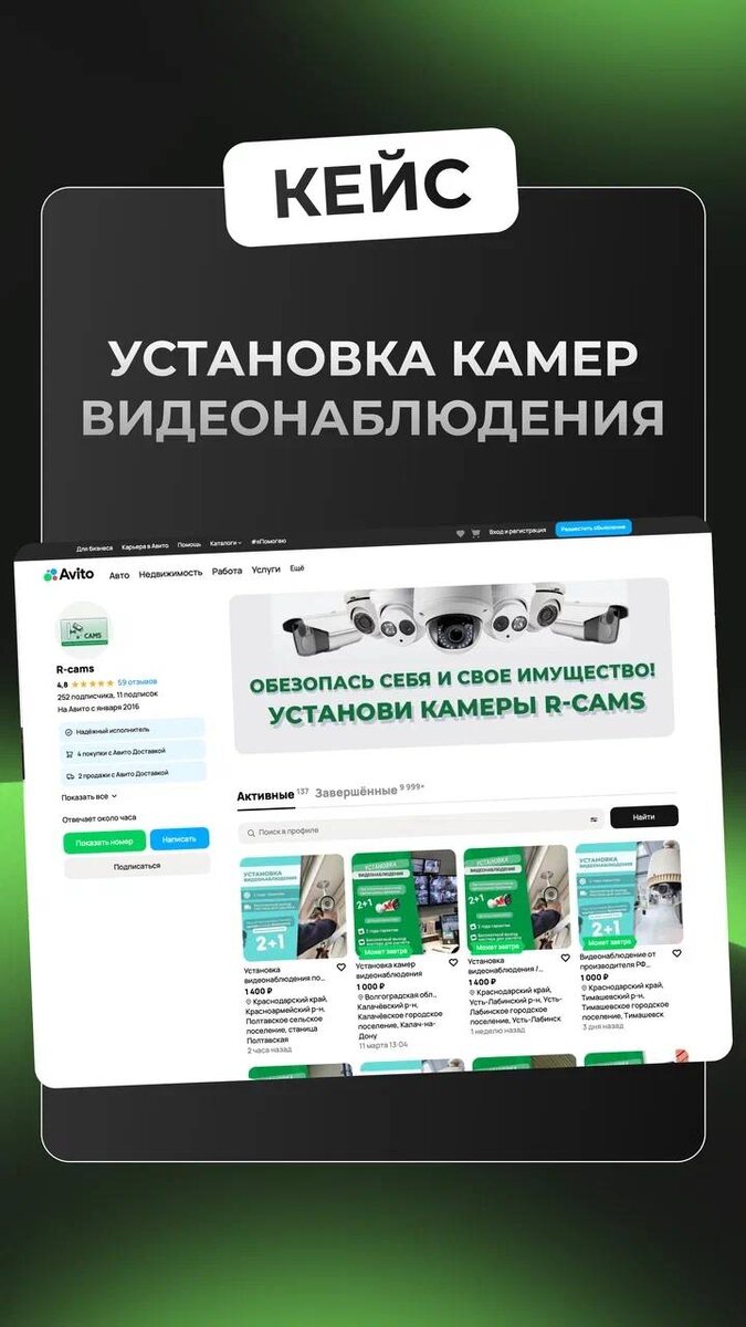 Кейс: установка камер видеонаблюдения Компания: Rcams ГЕО: Ростов-на-Дону и ЮФО. Ниша: монтаж видеонаблюдения #кейс_моретрафика Аналитика спроса и конкуренции В первую очередь мы выявили города, интересные для публикации: собрали данные по уровню спроса и сопоставили их с конкуренцией. Например: в городе Георгиевск спрос оказался намного выше конкуренции(на 20+ запросов в месяц приходится всего 5 объявлений без услуг продвижения). Исходя из данной аналитики, определили необходимое кол-во публикаций и стратегию дополнительного продвижения. Уникализация В городах с высокой конкуренцией публикуем по 7 уникальных объявлений(7 разных мастеров компании). Так же в этой нише можно уникализировать объявления, указывая разные бренды камер. Упаковка объявлений Добавили высокочастотные запросы в тексты. Примеры ключевых запросов: установка камер видеонаблюдения, установка видеонаблюдения, монтаж видеонаблюдения, монтаж камер видеонаблюдения, видеонаблюдение, камеры видеонаблюдения. На г