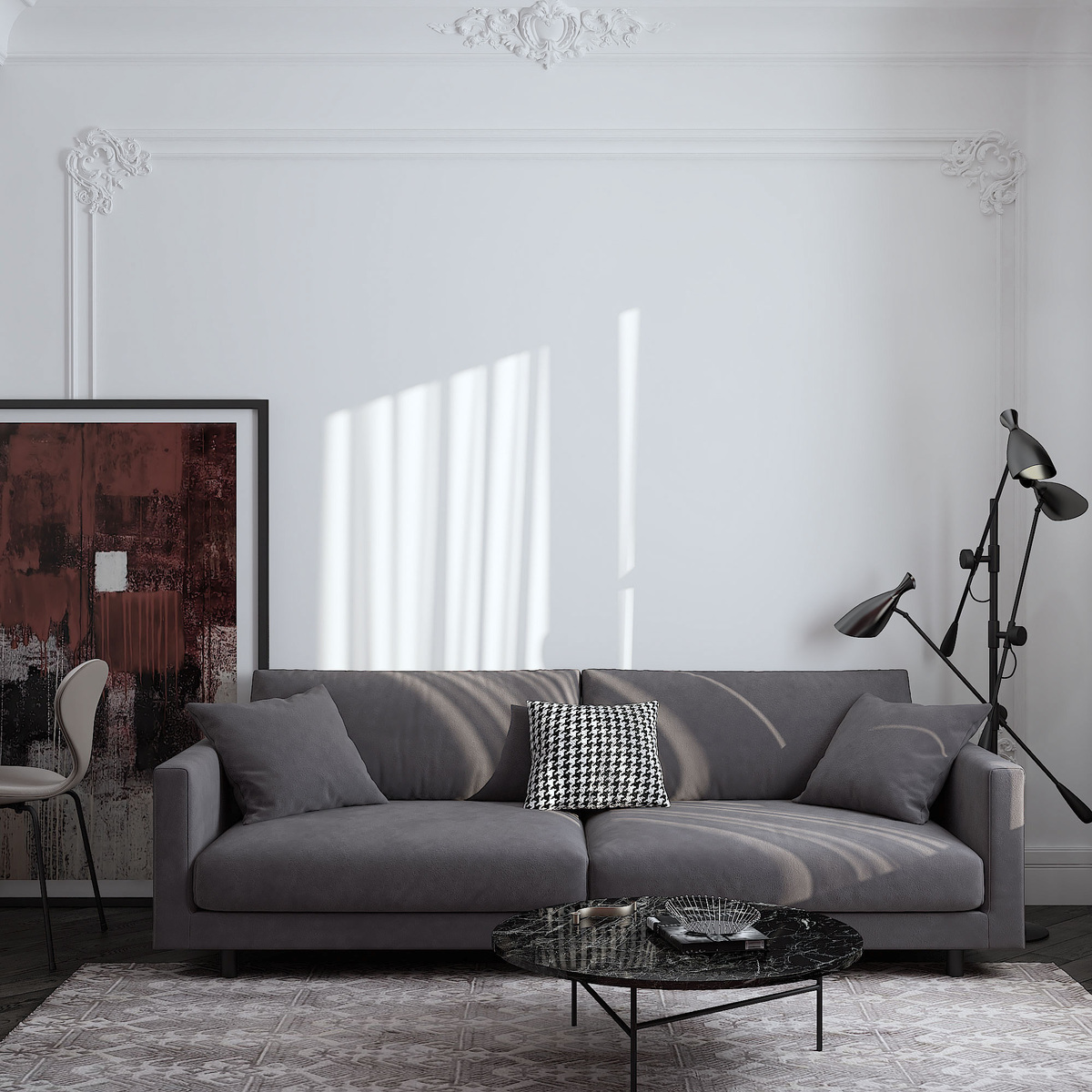 Особенностью стала отделка в белом цвете с акцентными стенами, молдингами, карнизами и потолками с вензельными элементами. В основе цветовой гаммы всего интерьера черно бело серые оттенки разбавленные яркими и приглушенными бордово вишнево шоколадными цветами в гостиной и кухне, а также припыленным розово бежевом цветом в спальне, и рыжекоричневыми акцентами в ванной и прихожей.