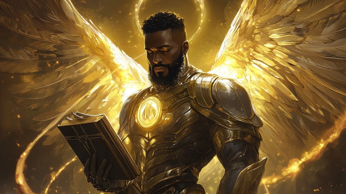 Создано на основе запроса: A glorious African American angel stands tall, radiating divine strength and serenity. He has a noble expression and a well-groomed beard, exuding wisdom and grace. His body is clad in sleek, futuristic golden armor that gleams with celestial energy, blending elements of ancient and sci-fi design. Massive golden wings extend majestically from his back, their feathers shimmering in the golden light. Cradled in his hands is a glowing Bible, emitting a soft, radiant golden aura that illuminates his face with reverence. He gazes intently at the sacred text, lost in divine contemplation. The entire image is bathed in rich gold hues, with light cascading around him like a heavenly spotlight, evoking a sense of sacred power and peace. --- Автоперевод: Славный афроамериканский ангел стоит высокой, излучая божественную силу и безмятежность. Отлично получилось? 🤔 https://dzen.ru/id/65c0c65c86e4f837c27b24d7 #ИИ #AI #нейросеть #midjourney #art
