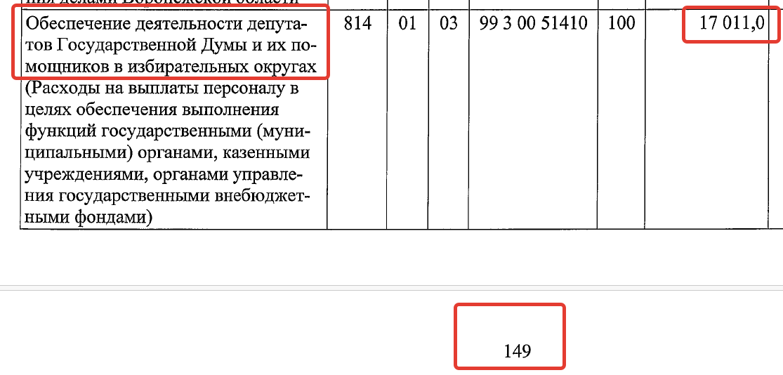 Расходы в сумме 17 млн 11 тыс рублей предполагают выделение этих денег на выплаты персоналу, в основном на зарплаты помощников депутатов Госдумы в избирательных округах. «Воронежских» депутатов ныне насчитывается 9 мужчин, то есть на каждого выходит по 1,8 млн рублей из казенных средств. Для увеличения фонда зарплаты помощников депутаты иногда используют внебюджетные источники, в частности, собственные средства.