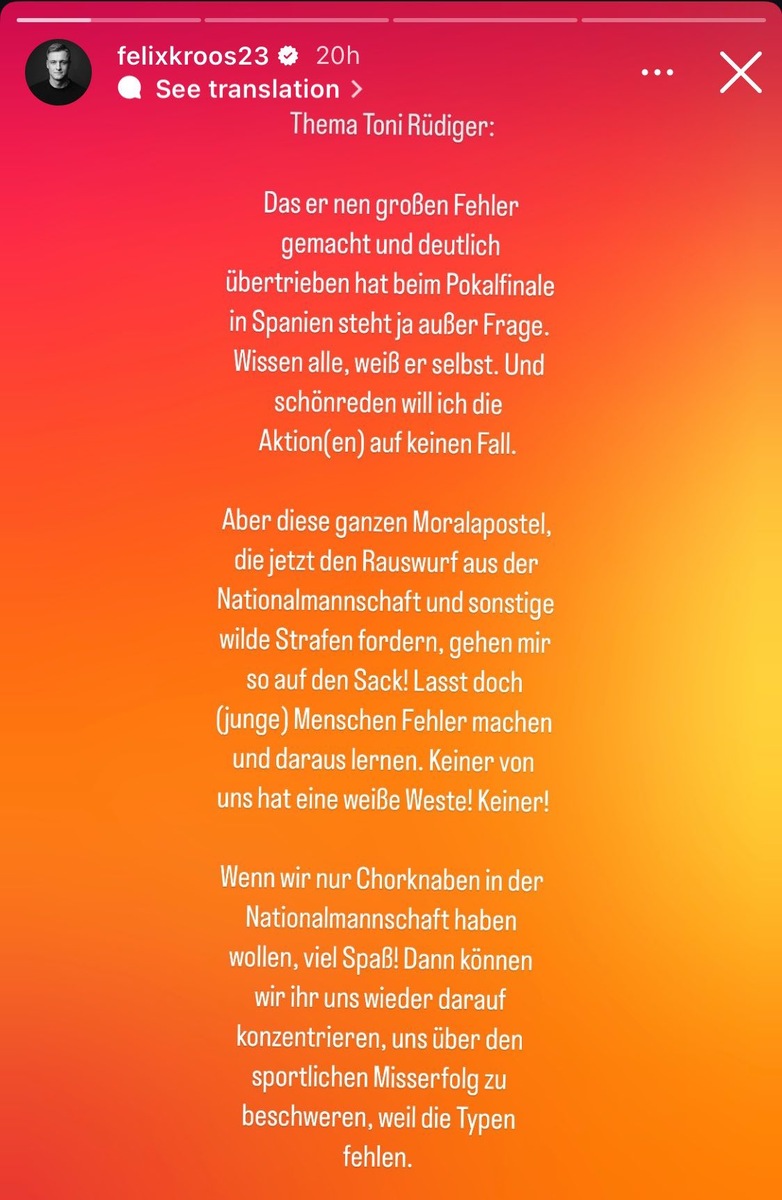После концерта Тони Рюдигера в концовке финала Кубка Испании над немцем навис длительный бан, а в Германии поднялась серьезная дискуссия о том, стоит ли вызывать защитника в расположение сборной. На защиту Рюдигера встали братья Тони и Феликс Кроос. Легенда «Мадрида» высказался о ситуации на турнире немецкой медиалиги: «Я написал ему после матча, он и сам знает, что допустил несколько ошибок. Видео говорят сами за себя, но он и сам полностью осознает свою вину. Он будет дисквалифицирован, что я считаю справедливым, но мы не должны вести себя так, будто он кого-то убил. Люди не знают многого из того, что происходит за кулисами. Это было класико, финал Кубка, Рюдигер сражался, как лев, хотя несколько месяцев играл с болью в колене, есть много проблем. Теперь он получит дисквалификацию, и на этом все. А мы не должны слепо следовать за волной коллективного возмущения. Сейчас отовсюду звучат требования исключить Тони из национальной команды. Так говорят даже те, кто в свое время сам заслужи