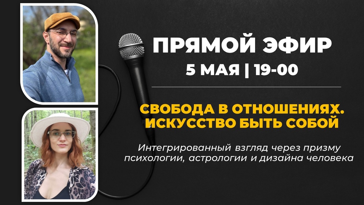 🌟 Приглашаем вас на живой, честный и глубокий разговор о свободе в отношениях! 🌟 📅 5 мая в 19:00 мы, Лев Лившиц (психодрама-терапевт, психолог, нарративный практик, аналитик по дизайну человека, музыкант и публицист) и Ксения Ламонова (телесно-ориентированный психолог, системный семейный консультант, астролог, режиссёр), проведем эфир, который поможет вам взглянуть на отношения по-новому. 💬 О чем будем говорить: · Что такое свобода в отношениях и как ее достичь? · Границы: как их устанавливать и уважать? · Долг и вина: как освободиться от этих ловушек? · Проблемы от недостатка свободы: контроль, созависимость, страх одиночества. · Абьюз: как распознать насилие и защитить себя? · Дозволенность: где грань между свободой и неуважением? · Совместимость: как осознанность помогает быть с любым человеком? 🔍 Мы разберем ваши ситуации через призму психологии, астрологии и дизайна человека. Узнаем, что мешает гармонии с партнером, и посмотрим на совместимость ваших бодиграфов и натальных ка