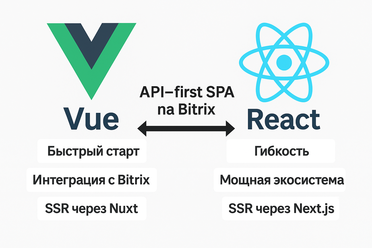 Разработка современных веб-приложений всё чаще основывается на архитектуре API-first, где сервер (в нашем случае Bitrix) лишь поставляет данные, а фронтенд целиком реализован в виде SPA (Single Page Application). На этом этапе возникает закономерный вопрос: какой фреймворк выбрать — Vue или React?