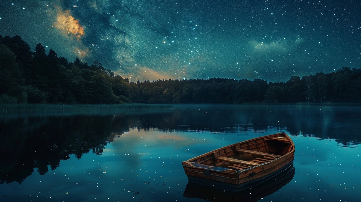 Создано на основе запроса: a tranquil lake with a little wooden boat and with a clear starry night sky, peaceful still water, surrounded by