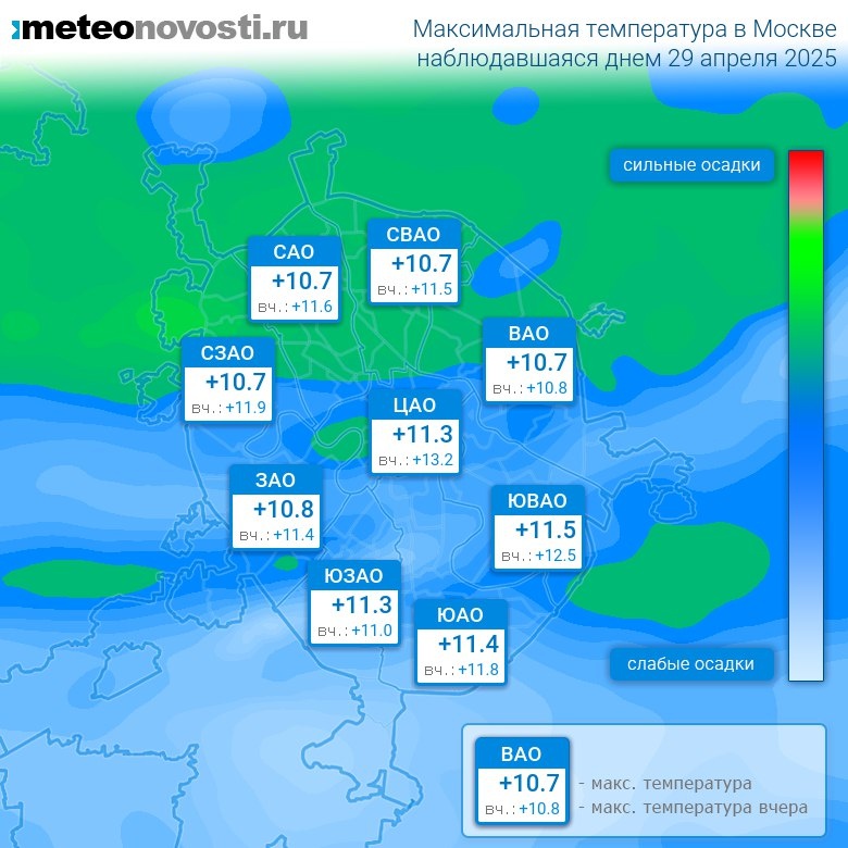 #за12часов #день Прошедший день 29 апреля был на 0.5°C холоднее вчерашнего. Максимальная температура днём в Москве оказалась на 5.8°C ниже нормы, что немного холоднее, чем обычно. Самая высокая температура +11.5°C была зафиксирована в 16 часов на юго-востоке города, а холоднее всего было на востоке: +8.7°C. Разница по максимальной температуре в разных частях столицы составила за день 2.8°C. Максимальные порывы ветра днём достигали 8 м/с. Атмосферное давление за день понизилось с 746 до 741 мм.рт.ст. Осадков не наблюдалось. Самый теплый день в Москве 29 апреля был в 2012 году, когда максимальная температура составила +28.9°C, а холодный в 1902 году: +2.3°C. Перейти на сайт Прогноз погоды на 14 дней