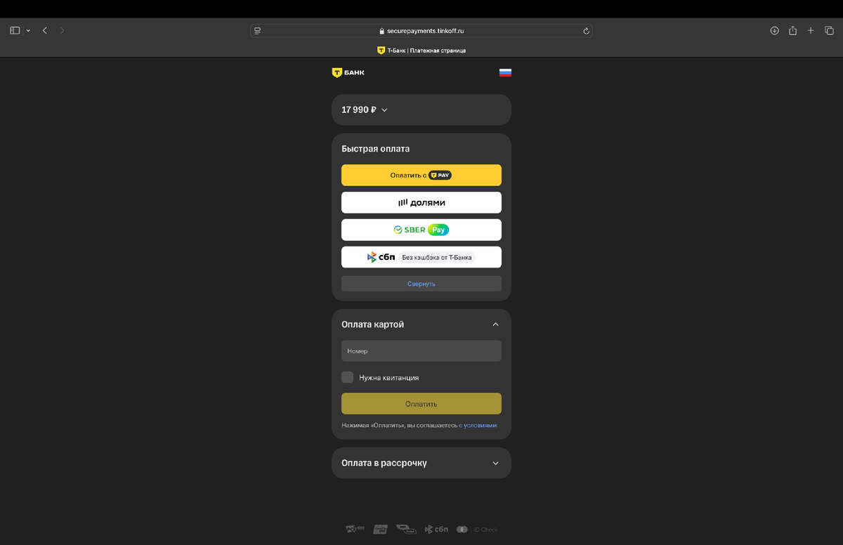 - С сайта покупатель попадает на страницу интернет-эквайринга от Т-кассы и оплачивает товар любым удобным способом;