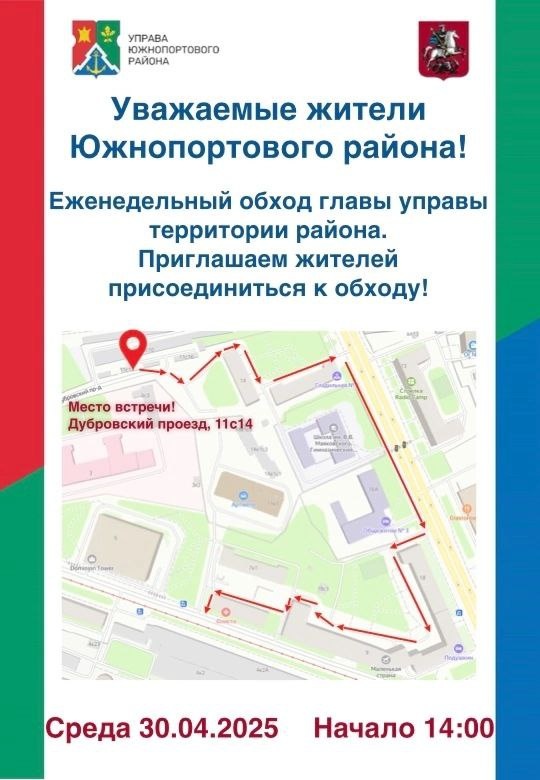 Уважаемые жители Южнопортового района! В среду, 30 апреля, глава управы Южнопортового района проведет обход территории. Начало обхода в 14:00. Место встречи: Дубровский проезд, 11 стр 14 и далее по маршруту. На обходе будут присутствовать: глава управы, первый заместитель главы управы, руководитель и заместители руководителя ГБУ «Жилищник района Южнопортовый», начальник участка и муниципальные депутаты. Вы сможете задать вопросы, обсудить важные темы и поделиться своими предложениями по улучшению жизни в нашем районе. Ждем Вас на встрече!