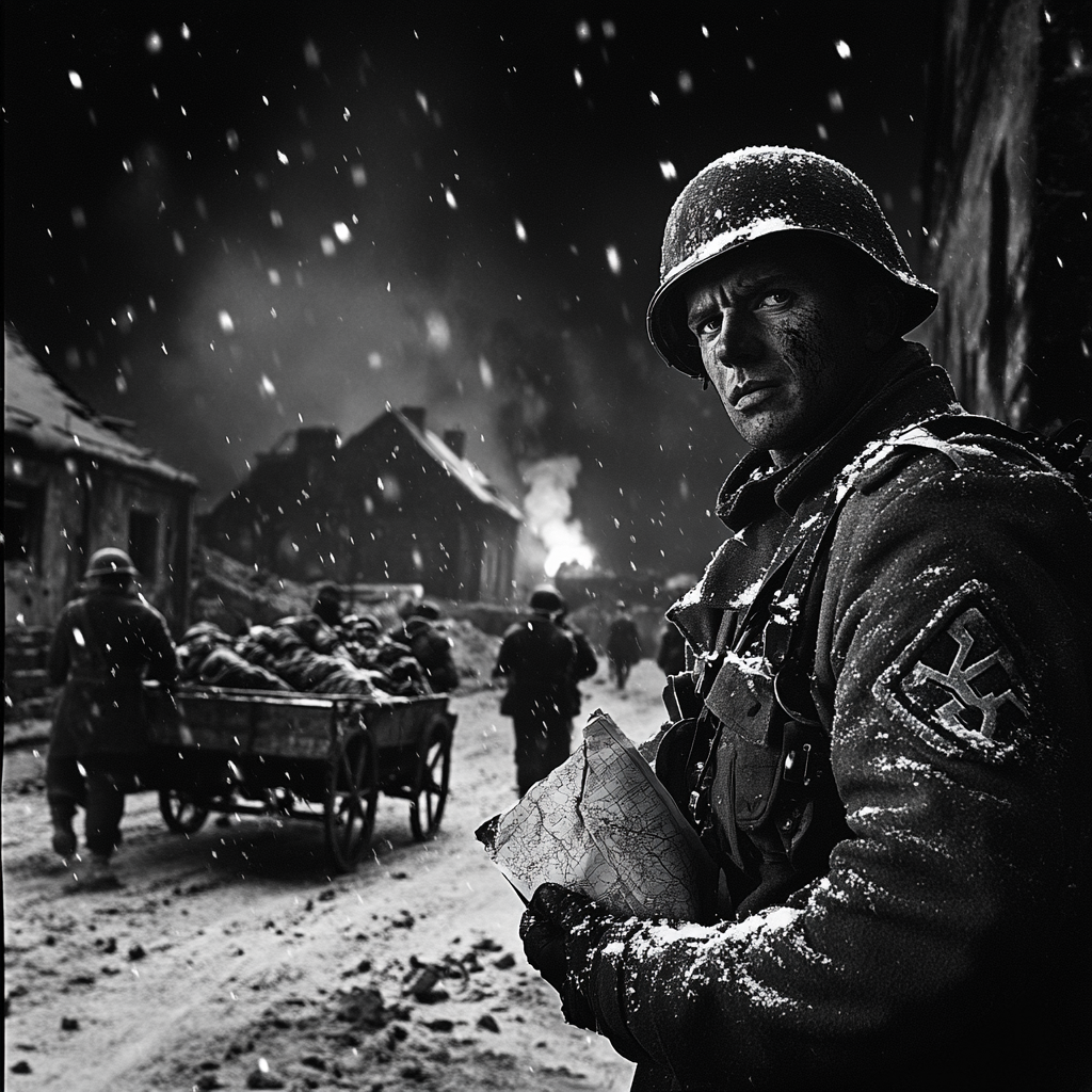 Эрих Вольф стоял у горящей избы, сжимая в руках мятую карту, на которой карандашные линии отступления казались насмешкой над всем, во что он когда-то верил. Деревня, еще вчера служившая опорным пунктом его роты, теперь пылала, и едкий дым щипал глаза, смешиваясь с запахом горелого дерева и сырой земли. Пламя лизало стены, пожирая соломенную крышу, и искры взлетали в ночное небо, как звезды, падающие в пропасть. Снег, покрывавший землю, был черным от сажи, а мороз пробирался под шинель, кусая кожу, несмотря на замотанный вокруг шеи шарф. Эрих, 24-летний фельдфебель, выглядел старше своих лет: его серые глаза, холодные, как сталь, и коротко стриженные волосы под каской придавали ему суровый вид человека, рожденного для войны. Но внутри него что-то треснуло, как лед под сапогами, и он не был уверен, сможет ли это скрыть.