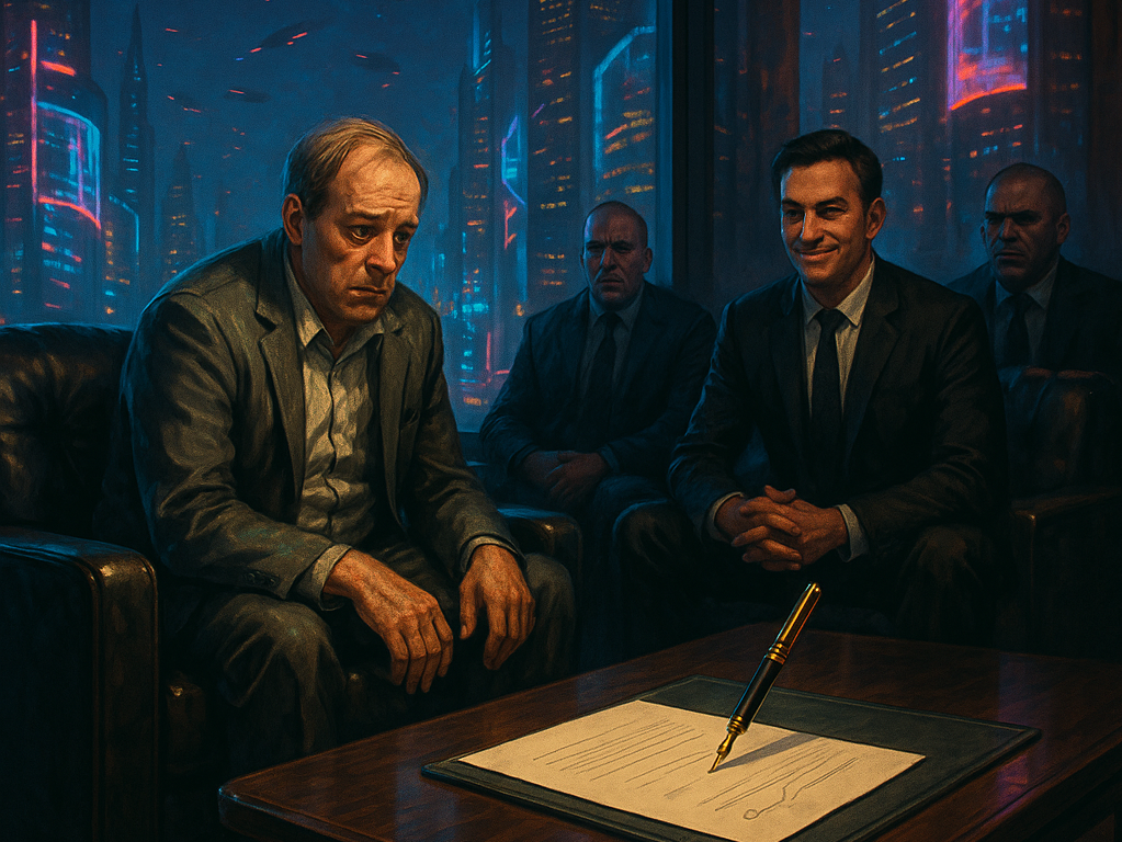 – Сразу хочу попросить прощения за мой внешний вид – тело прокатное, так что… – Афанасий Петрович раздосадованно посмотрел на себя сверху вниз. – Я-то за тыщи километров отсюда, никак лично приехать не мог. – Ничего страшного, Афанасий Петрович! Закон позволяет ставить подпись чужой рукой, лишь бы ею управляло ваше сознание. – Да-да, я понимаю. Просто этот костюм и ботинки… – О, поверьте – мы видали и похуже! Нотариус пригласил его сесть в шикарное кожаное кресло – так, чтобы посетителю открывался умопомрачительный вид из окна: сверкающий миллионами огней город, цепочки парящих в небе флайеров, огромные голограммы, обнимающие стоэтажные башни. – Ну что ж, – нотариус потер руку об руку. – Мы с господами Крутилиными, – показал на двух бугаев, сидевших рядом, на диванчике, – внимательно изучили ваше предложение и господа согласились с предложенной ценой! Вот договорчик… Он подпихнул лежащую на журнальном столике бумагу ближе к Афанасию. – Вы ставите подпись и в тот же момент денежки пер