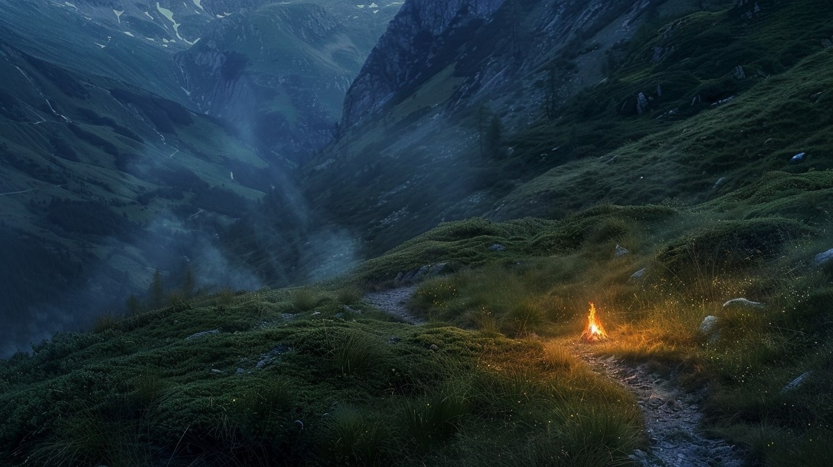 Создано на основе запроса: a narrow mountain trail at dusk, featuring a small campfire glowing by the path, warm emotional light in a fading